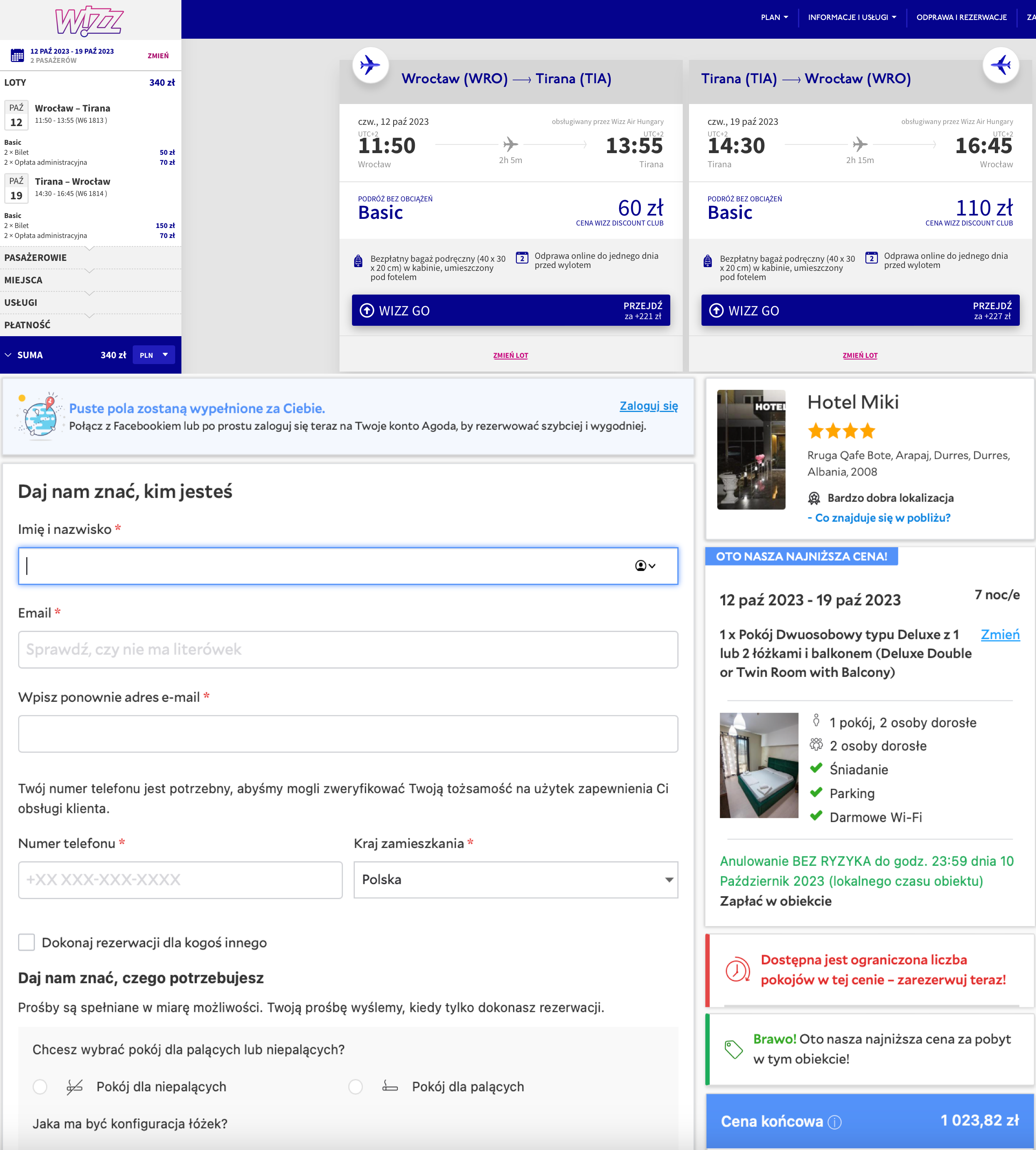 Wylot do Tirany z Wrocławia na pokładzie samolotu Wizz Air. Cena 682 zł za osobę przy dwóch osobach podróżujących. Zawiera przeloty i zakwaterowanie. Suma nie zawiera transferów oraz ubezpieczenia.