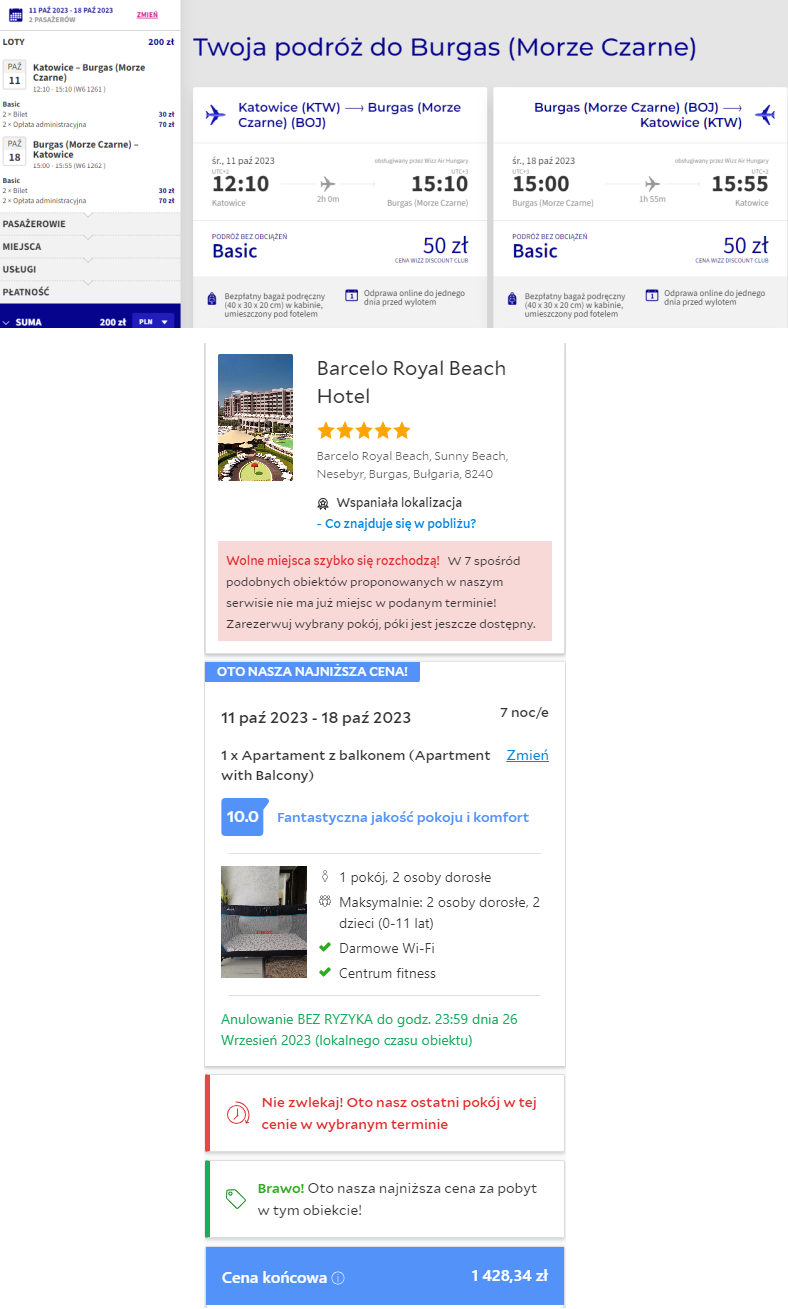 Wyloty do Burgas z Katowic. Cena 814 zł za osobę przy dwóch osobach podróżujących. Zawiera przeloty i zakwaterowanie. Suma nie zawiera transferów oraz ubezpieczenia.