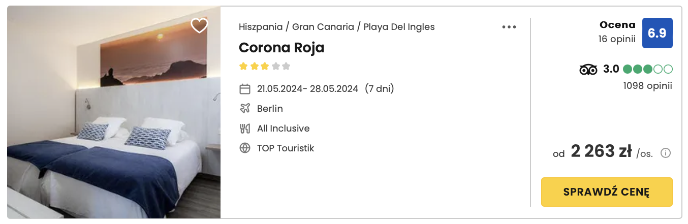 Wylot do Hiszpanii z Berlina. Corona Roja znajduje się 5 minut spacerem od plaży. Każdy pokój wyposażony jest w klimatyzację i prywatną łazienkę.