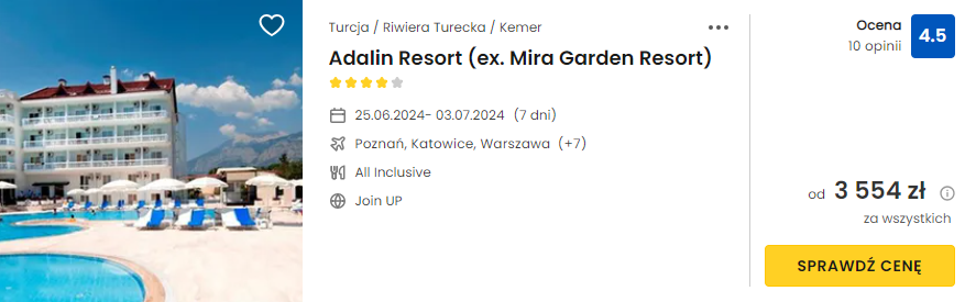 Wyloty do Antalyi z Bydgoszczy, Gdańska, Katowic, Krakowa, Lublina, Łodzi, Poznania, Rzeszowa, Warszawy oraz Wrocławia. 4* Adalin Resort znajduje się w centrum kurortu Kremer. Na gości czeka odkryty basen, zaplecze sportowe oraz animacje.