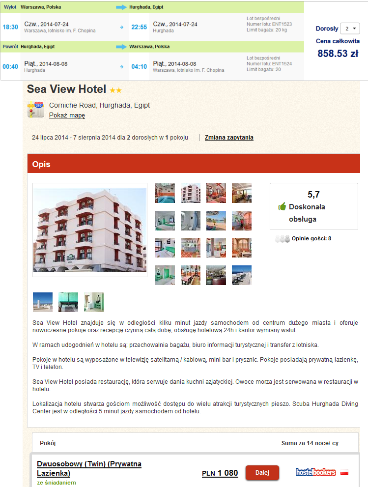 Przelot czarterowy na trasie Warszawa - Hurghada - Warszawa za 429 zł/osoba (wybieramy przelot dla dwóch osób za 858 zł) rezerwujemy na Rainbowtours.pl