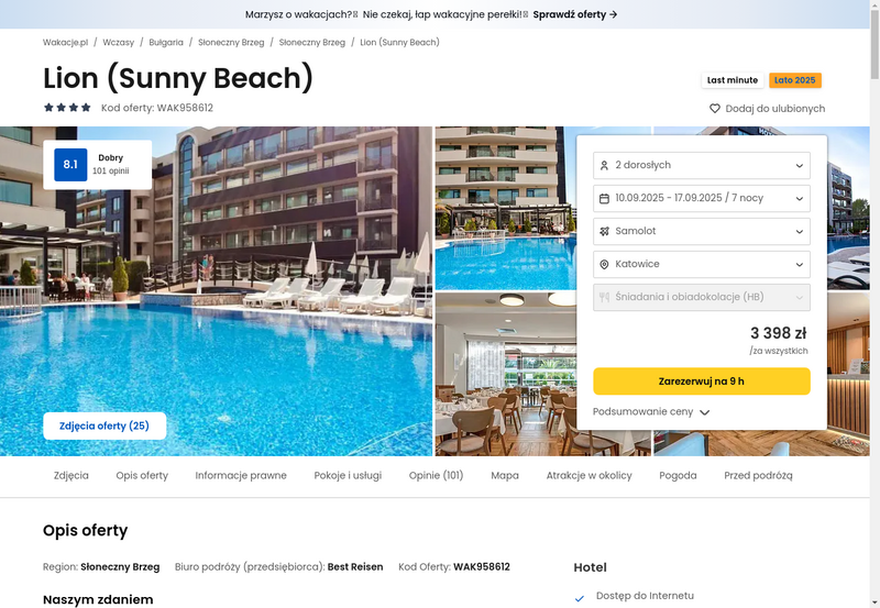 Aktualizacja: Ostatnie promienie lata: Słoneczny Brzeg, 4* hotel z wyżywieniem od 1535 zł