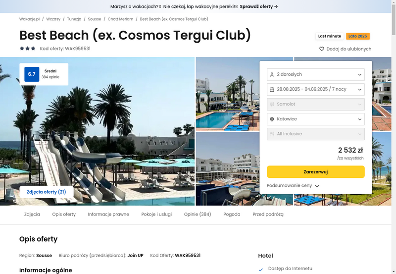 Misją Lastminuter.pl jest przedstawienie Ci najlepszych zdaniem naszej redakcji okazji na podróże. Opisujemy oferty znalezione przez nas w internecie i wskazujemy adresy internetowe, pod którymi samodzielnie możesz wykupić podróż lub elementy podróży. Ceny w artykułach są aktualne w chwili publikacji. Możemy otrzymywać wynagrodzenie od partnerów handlowych, do których Cię przekierowujemy. Nie ma to wpływu na cenę Twojej wycieczki. Powielanie publikacji zabronione.