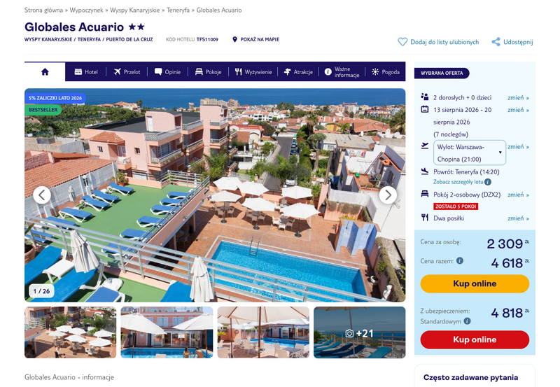 Aktualizacja: Wakacje 2026 roku: Teneryfa, hotel z wyżywieniem od 2192 zł. Dużo terminów