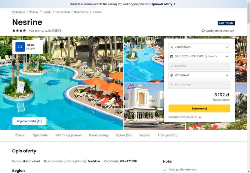 Choć hotel Nesrine może nie być bez skazy, to w połączeniu z klimatem Hammametu i formułą all inclusive, całość składa się na udany wyjazd dla tych, którzy szukają odpoczynku w słońcu bez zbędnych komplikacji.