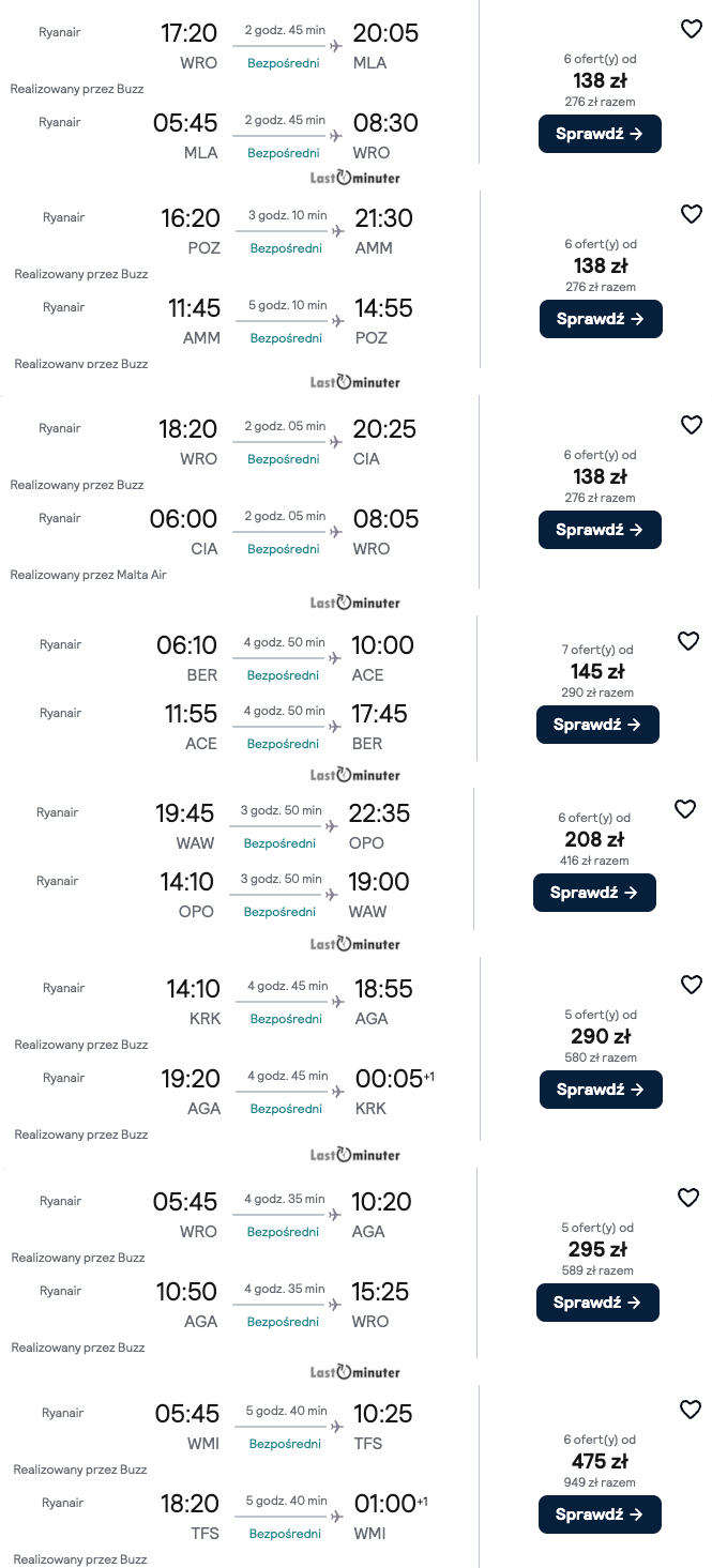 Agadir, Amman, Lanzarote, Porto, Rzym, Teneryfa, Wyspy Kanaryjskie, Berlin, Kraków, Poznań, Warszawa, Wrocław
