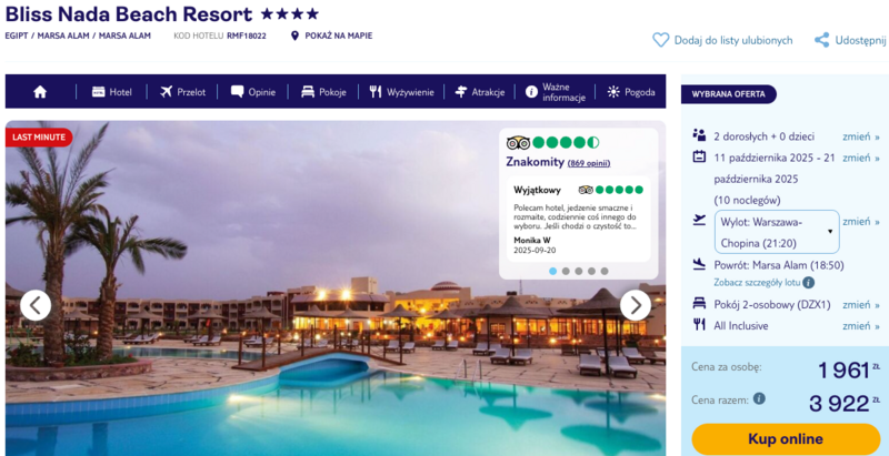 Jeszcze w październiku proponowana jest wycieczka do hotelu Bliss Nada Beach Resort, który działa w opcji all inclusive. To wygodne rozwiązanie dla tych, którzy chcą mieć wszystko pod ręką – posiłki, napoje i przekąski dostępne przez cały dzień. Obiekt położony jest tuż przy Morzu Czerwonym, co oznacza nie tylko świetny widok, ale też łatwy dostęp do plaży i wyjątkowo czystej wody. Dodatkowym atutem jest pobliska rafa koralowa – świetna wiadomość dla fanów nurkowania i snorkelingu.