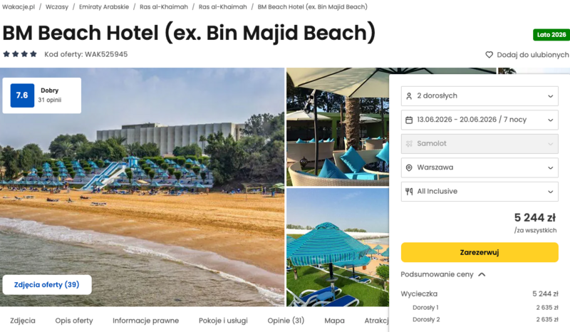 Wyloty z Warszawy i Warszawy (Modlin) do Zjednoczonych Emiratów Arabskich to świetny pomysł na oderwanie się od codzienności i spróbowanie czegoś wyjątkowego. Pobyt w czterogwiazdkowym BM Beach Hotel to przepis na relaks w dobrym stylu – bez martwienia się o detale, bo opcja all inclusive obejmuje nie tylko wygodne pokoje, ale też smaczne posiłki i sporo udogodnień.