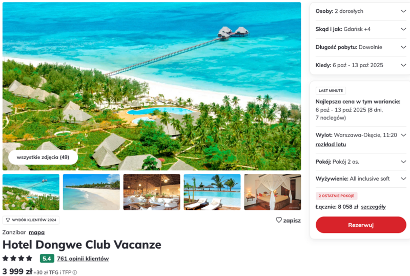 Wyloty z Warszawy, Poznania i Katowic na Zanzibar to świetny sposób, by oderwać się od codzienności i spędzić wczasy w naprawdę malowniczym miejscu. Twoją bazą wypadową będzie czterogwiazdkowy hotel Dongwe Club Vacanze, który zapewnia wygodę, świetne jedzenie i pełną opcję all inclusive – czyli wszystko, co potrzebne, by naprawdę odpocząć.