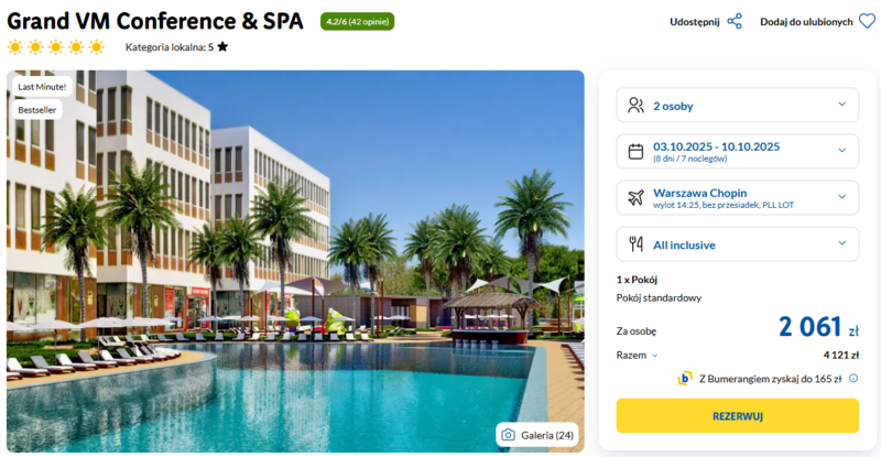 Wylot na Bałkany z Warszawy. Spędź wczasy w nowoczesnym hotelu Grand VM Conference & SPA. To miejsce oferuje komfort na wysokim poziomie i pełne wyżywienie w formule all inclusive. Codzienne posiłki są serwowane w formie bufetu, a wybór napojów zadowoli każdego. Goście chwalą przede wszystkim smaczne, dobrze przygotowane jedzenie, które pozwala spróbować lokalnych i międzynarodowych smaków.