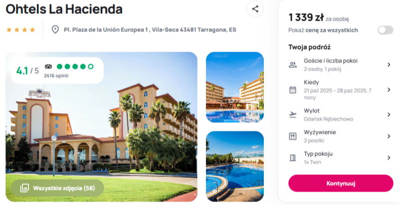 Wyloty z Gdańska, Krakowa, Katowic, Warszawy i Wrocławia to wygodna opcja dla wszystkich, którzy chcą szybko znaleźć się w słonecznym klimacie. W miejscowości La Pineda czeka czterogwiazdkowy hotel Ohtels La Hacienda, który może przypaść do gustu zarówno rodzinom, jak i osobom szukającym spokojnego wypoczynku. Położony zaledwie 250 metrów od plaży, oferuje łatwy dostęp do morza i wielu atrakcji w okolicy.