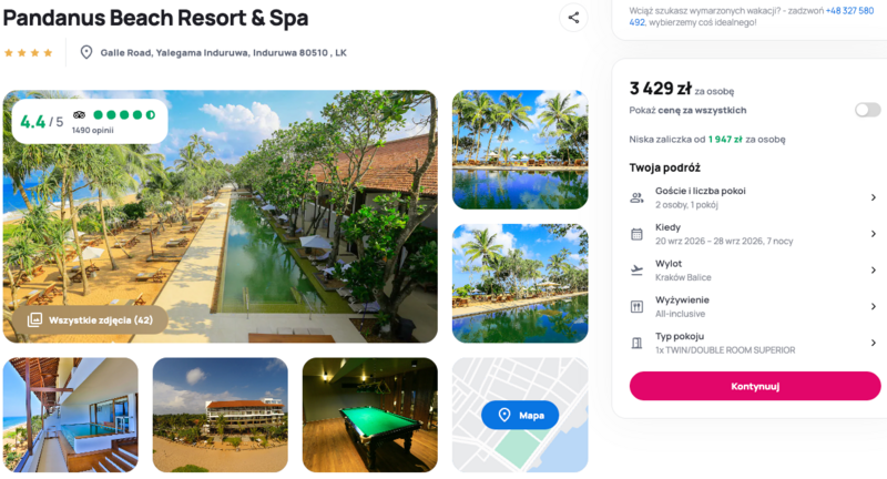 Pandanus Beach Resort & Spa to świetne miejsce dla tych, którzy szukają relaksu blisko natury. Obiekt położony jest tuż przy spokojnej plaży Induruwa, co pozwala cieszyć się szumem fal praktycznie od świtu do zmierzchu. Pokoje z balkonami, wygodne udogodnienia i spokojna atmosfera to tylko niektóre z atutów tego hotelu. Na miejscu można korzystać z basenu, siłowni, a opcja all inclusive sprawia, że o jedzenie nie trzeba się martwić. W restauracjach serwowane są zarówno lokalne przysmaki, jak i dobrze znane dania międzynarodowe.