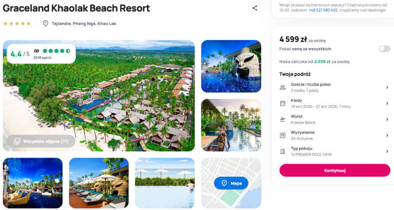 Wyloty z Krakowa, Warszawy i Warszawy (Modlin) to początek egzotycznej przygody, która może okazać się dokładnie tym, czego potrzeba na udany urlop. Propozycja pobytu w Graceland Khaolak Beach Resort to coś dla tych, którzy marzą o relaksie w pięknym otoczeniu, blisko natury i z dala od codziennego pośpiechu. Położony tuż przy plaży, w spokojnej miejscowości Takua Pa, resort oferuje nie tylko świetną lokalizację, ale też komfort i gościnną atmosferę – co znajduje odzwierciedlenie w ocenie 4.4/5 wystawionej przez dotychczasowych gości.