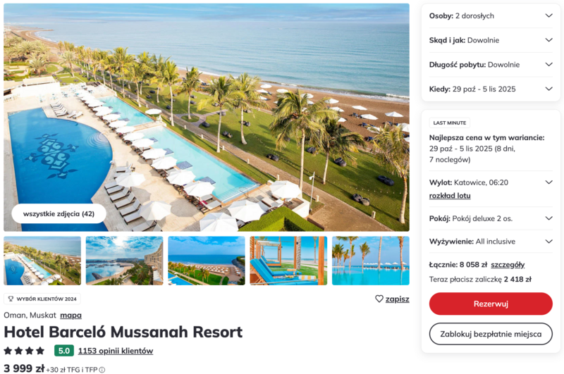 Wyloty do Muskatu z Katowic i Warszawy. Ta wycieczka to świetna okazja na pełen relaks – szczególnie, że zakwaterowanie przewidziane jest w komfortowym Barceló Mussanah Resort, oferującym wygodną opcję all inclusive.