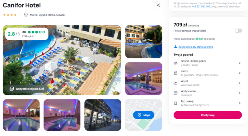 Biorąc pod uwagę standard obiektu, lokalizację i możliwość wybrania opcji z wyżywieniem, cena wyjazdu wypada naprawdę korzystnie. Wrażenia poprzednich podróżników podpowiadają, że Canifor Hotel może być dobrym wyborem na odpoczynek i poznanie uroków Malty – zarówno dla rodzin, jak i par szukających spokojnej, ale ciekawej grudniowej przygody.
