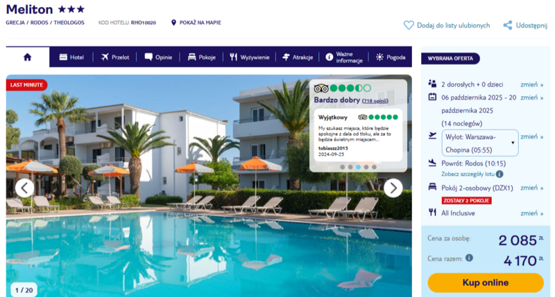 Biorąc pod uwagę lokalizację, formułę all inclusive oraz cenę, oferta wypada całkiem korzystnie. To dobra propozycja dla osób, które szukają spokojnego miejsca na wypoczynek, a jednocześnie są ciekawe tego, co ma do zaoferowania Rodos.