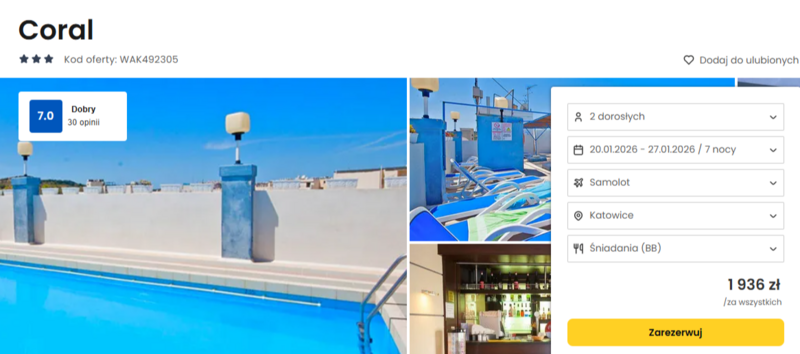 Wylot z Gdańska, Katowic, Krakowa, Poznania, Rzeszowa, Warszawy lub Wrocławia na słoneczną Maltę to propozycja, która może przypaść do gustu szczególnie w czasie zimniejszych miesięcy. Na miejscu czeka hotel Coral, który cieszy się pozytywnymi opiniami wśród gości – przede wszystkim za świetną lokalizację blisko plaży oraz łatwy dostęp do restauracji i barów w urokliwym miasteczku Bugibba.