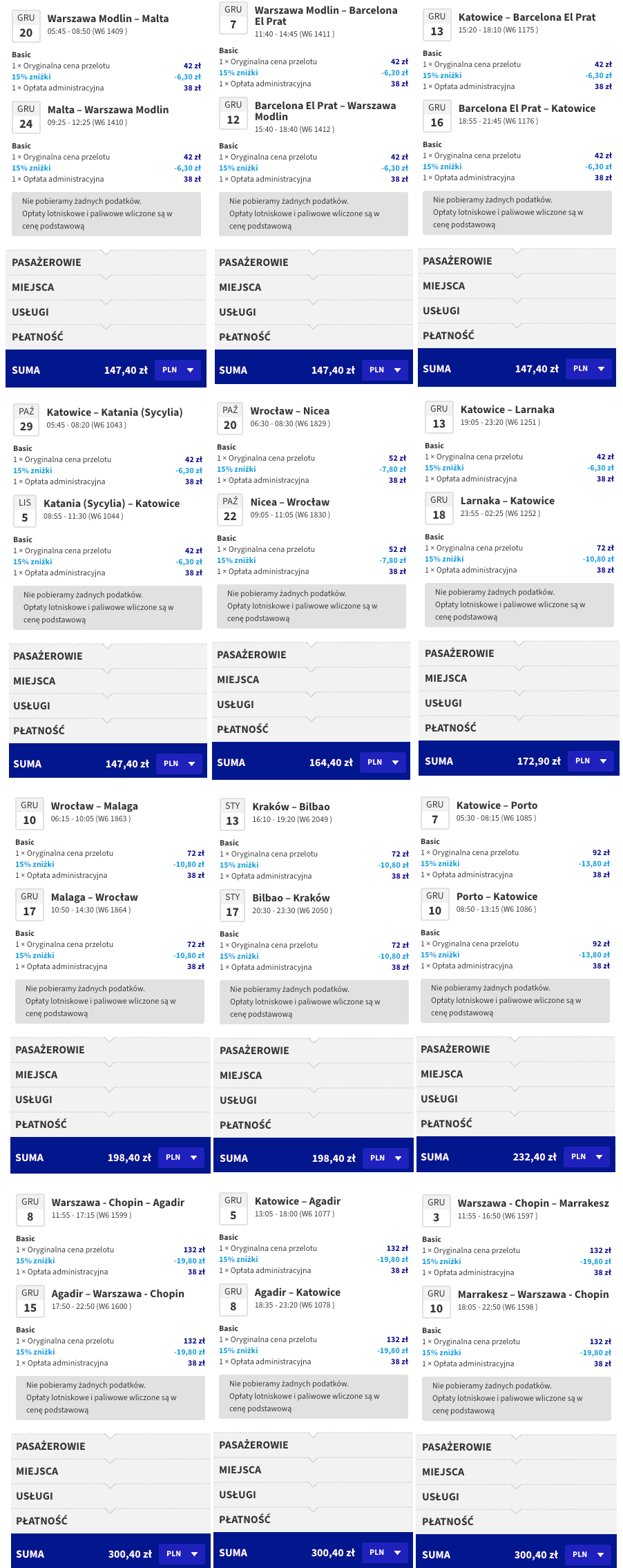 Agadir, Andaluzja, Barcelona, Bilbao, Larnaka, Malaga, Marrakesz, Porto, Sycylia, Katowice, Kraków, Warszawa, Wrocław