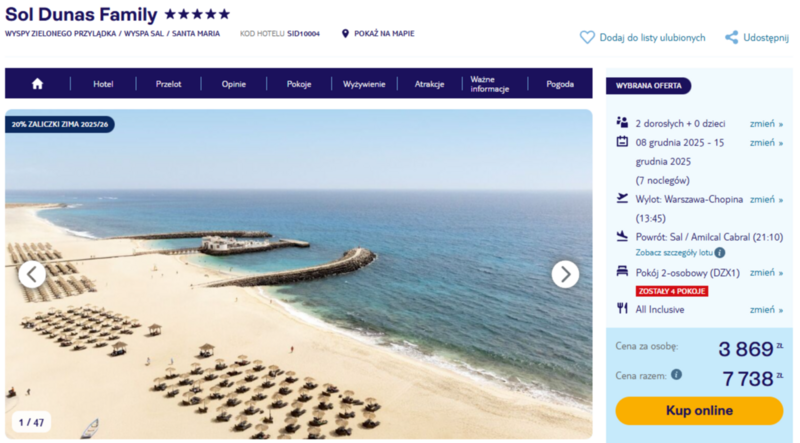 Na miejscu czeka Sol Dunas Family – hotel, który spełni oczekiwania zarówno rodzin z dziećmi, jak i tych, którzy liczą na relaks w przyjemnym otoczeniu. Formuła all inclusive oznacza, że jedyne, czym trzeba się martwić, to jaki koktajl wybrać przy basenie. A opcji do spędzania czasu tutaj nie brakuje: miniaquapark i trzy duże baseny zewnętrzne to raj dla dzieci, a strefa spa i różnorodne zajęcia sportowe pozwolą dorosłym zapomnieć o codziennych sprawach.