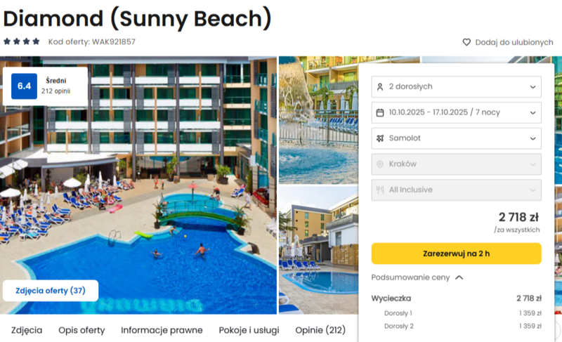 Na miejscu czeka Hotel Diamond – czterogwiazdkowy obiekt, który zapewnia wygodne warunki i komfortowy pobyt. Goście korzystają z opcji all inclusive, co oznacza dostęp do wielu smacznych posiłków i napojów przez cały dzień. W menu znaleźć można zarówno lekkie sałatki, dania mięsne, słodkości, jak i świeże owoce, dzięki czemu każdy znajdzie coś dla siebie. Goście w opiniach podkreślają też życzliwość obsługi i miłą atmosferę.