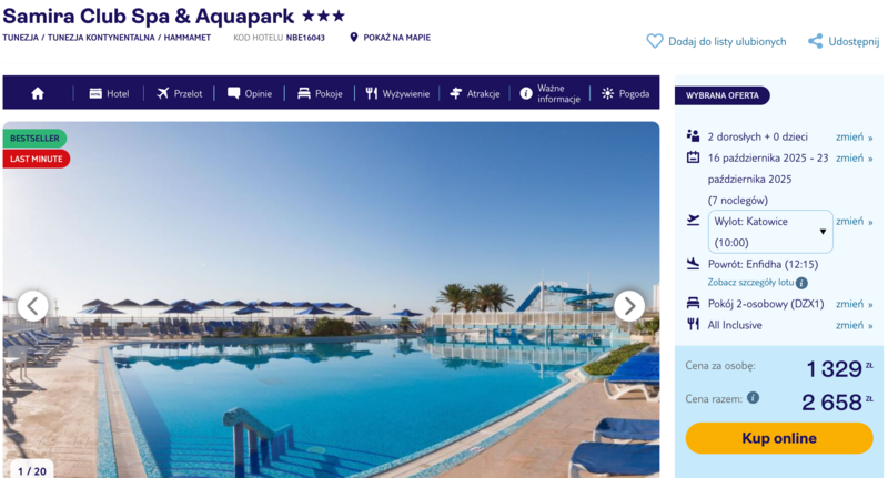 Wylot z Katowic i Warszawy. Miejscem docelowym jest hotel Samira Club Spa & Aquapark – popularny wybór wśród rodzin, szczególnie tych szukających wygody pakietu all inclusive.