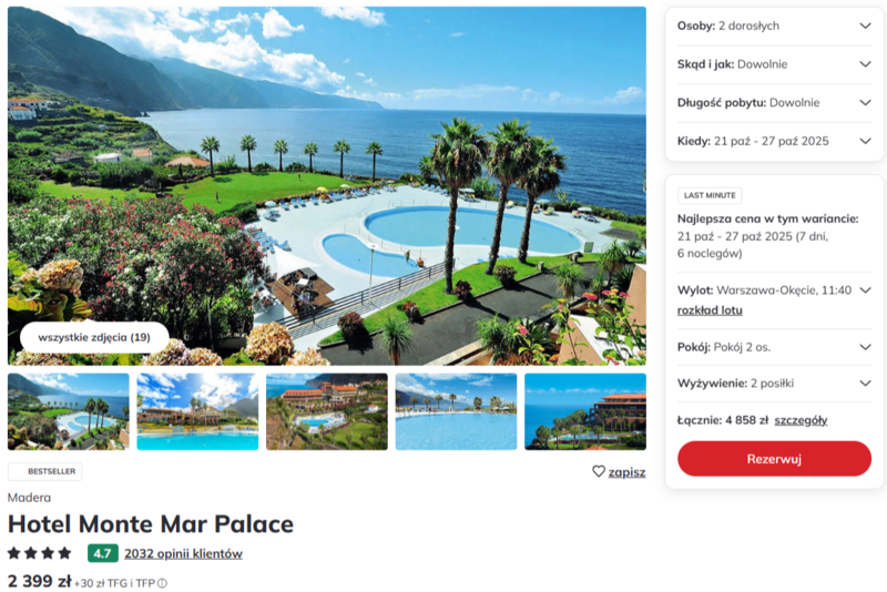 W ramach pobytu zaplanowano zakwaterowanie w czterogwiazdkowym Hotelu Monte Mar Palace, który znajduje się na klifie z widokiem na ocean. Goście szczególnie doceniają położenie obiektu – panorama, która rozciąga się z tarasów, naprawdę robi wrażenie. Sam hotel oferuje sporo udogodnień: basen, spa, różne atrakcje na miejscu i spokojną, wyciszającą atmosferę, dzięki której łatwo oderwać się od codzienności.