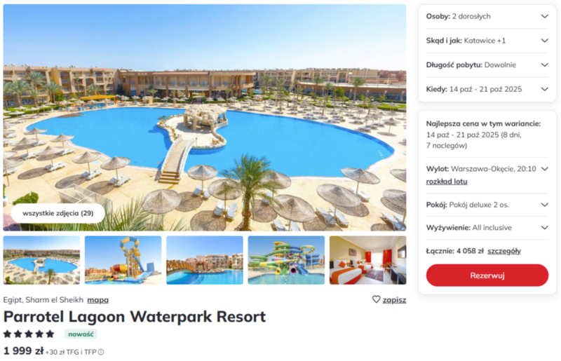Na miejscu czeka Parrotel Lagoon Waterpark Resort – hotel, który trudno pominąć, zwłaszcza jeśli szuka się miejsca pełnego atrakcji. Rozległy teren, aż dziewięć basenów i aquapark z 31 zjeżdżalniami robią naprawdę duże wrażenie. Dla dzieci to gwarancja dobrej zabawy, a dla dorosłych – czas na relaks. Sporym plusem jest też formuła all inclusive, która pozwala cieszyć się smacznymi posiłkami i napojami bez konieczności myślenia o dodatkach.