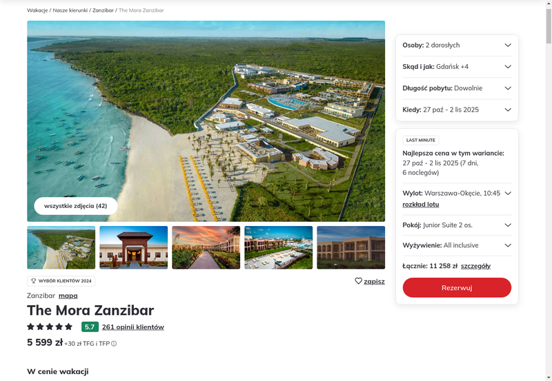 Na miejscu czeka hotel The Mora Zanzibar, który położony niemal na samej plaży, zapewnia wyjątkowy komfort w formule all inclusive. Pokoje urządzone są w nowoczesnym stylu, z dbałością o wygodę i relaks – klimatyzacja, minibar i Wi-Fi to tylko początek. W ciągu dnia można korzystać z bogatej oferty atrakcji – od sportów wodnych, przez zabiegi w spa, po smaki z różnych stron świata serwowane w restauracjach.