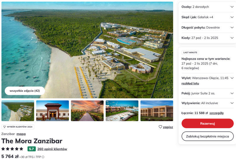 Na miejscu czeka hotel The Mora Zanzibar, który położony niemal na samej plaży, zapewnia wyjątkowy komfort w formule all inclusive. Pokoje urządzone są w nowoczesnym stylu, z dbałością o wygodę i relaks – klimatyzacja, minibar i Wi-Fi to tylko początek. W ciągu dnia można korzystać z bogatej oferty atrakcji – od sportów wodnych, przez zabiegi w spa, po smaki z różnych stron świata serwowane w restauracjach.