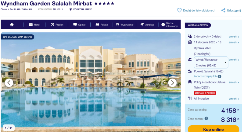 Wylot do Salalah z Warszawy i Katowic zapowiada się jako ciekawa propozycja dla tych, którzy marzą o odpoczynku w egzotycznym stylu. W planie jest pobyt w pięciogwiazdkowym hotelu Wyndham Garden Salalah Mirbat, który oferuje formułę all inclusive — idealną dla osób szukających wygody i pełnego relaksu.