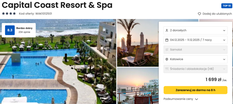 Wyloty z Katowic, Gdańska, Krakowa, Poznania, Warszawy i Wrocławia. Na miejscu czeka elegancki Capital Coast Resort & Spa w Pafos – hotel, który zbiera sporo pozytywnych opinii, zwłaszcza za komfortowe wnętrza, dobrą obsługę i świetną lokalizację.