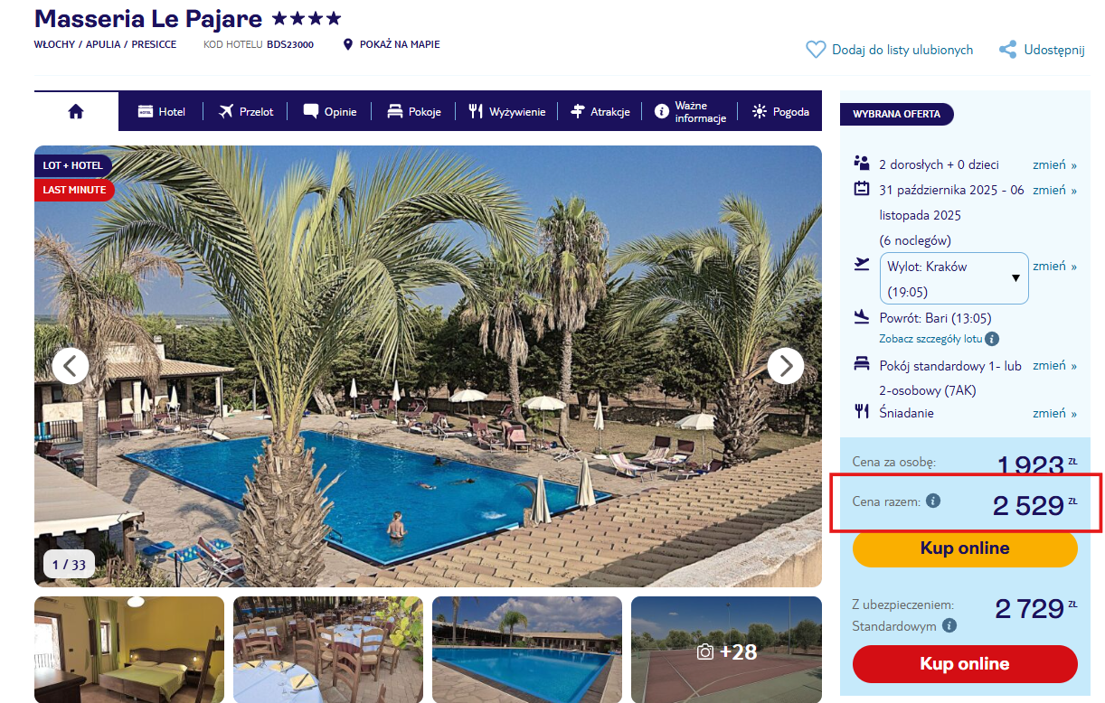 Na miejsce wypoczynku wybrano klimatyczny hotel Masseria Le Pajare w Apulii, który idealnie nadaje się na spokojny urlop z dala od tłoku i hałasu. Goście chwalą to miejsce przede wszystkim za czystość, świetną obsługę i przyjemny, ekologiczny charakter. Dodatkowym plusem jest bliskość piaszczystych plaż oraz przyjazna atmosfera, dzięki której łatwo się tu zrelaksować.