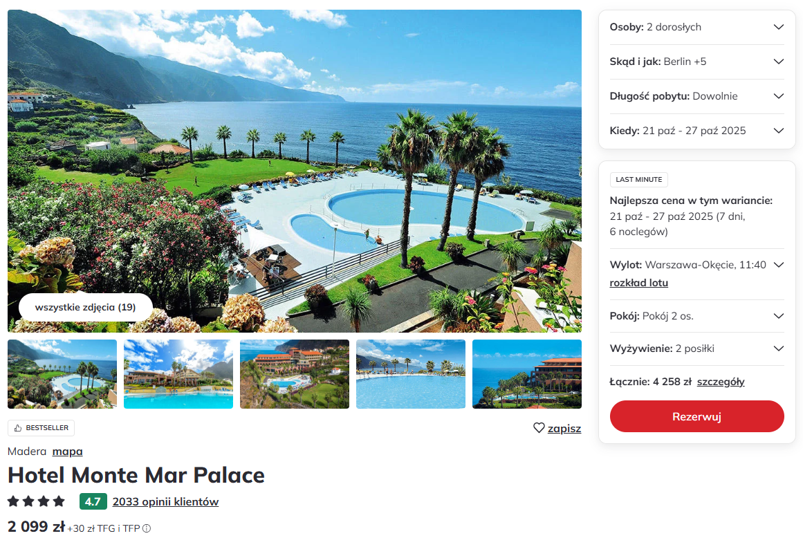 W tej ofercie mamy okazję zatrzymać się w hotelu Monte Mar Palace, położonym na klifie w miejscowości Ponta Delgada. Widoki na ocean zapierają dech w piersiach i od razu pozwalają poczuć się daleko od codziennego zgiełku. Miejsce cieszy się uznaniem wśród gości, którzy doceniają jego przyjazną atmosferę i jasne, przestronne wnętrza. Sam hotel może i nie jest zupełnie nowy, ale z pewnością zapewnia wygodny odpoczynek po dniu pełnym wrażeń.