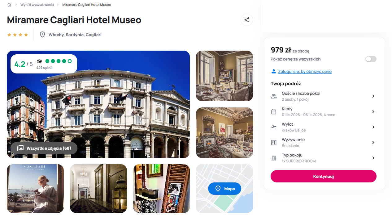 Na miejsce zakwaterowania wybrano designerski 4* Miramare Cagliari Hotel Museo, położony w samym sercu miasta. To doskonała baza wypadowa – wystarczy kilka minut spacerem, by dotrzeć do starego miasta czy usiąść przy plaży Poetto i delektować się nadmorskim klimatem. Hotel ma nietuzinkowy charakter – elegancki styl art deco i przytulne pokoje, w których można się naprawdę zrelaksować. Goście chwalą jakość obsługi i miłą atmosferę, co sprawia, że dobrze odnajdują się tu zarówno pary, jak i rodziny z dziećmi.