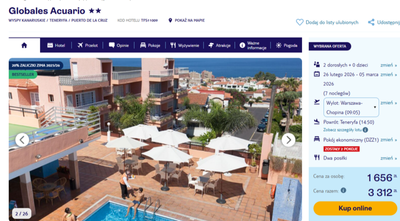 Na miejscu czeka hotel Globales Acuario, kameralny, 2* hotel w Puerto de la Cruz, położony niespełna 1,5 kilometra od malowniczej plaży Playa Jardin. W okolicy nie brakuje też atrakcji – w zasięgu spaceru są popularne baseny Lago Martianez. W hotelu można skorzystać z restauracji serwującej dania kuchni międzynarodowej oraz zrelaksować się przy basenowym barze. Choć pokoje nie należą do największych, ich czystość i podstawowe udogodnienia są dobrze oceniane i wystarczające, by komfortowo odpocząć po dniu pełnym wrażeń.