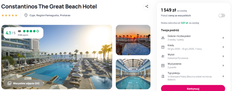 Celem podróży jest Constantinos The Great Beach Hotel w Protaras, tuż przy znanej plaży Fig Tree Bay. To miejsce, gdzie można poczuć klimat już od pierwszej chwili. Hotel oferuje komfortowe pokoje, piękne widoki i atmosferę sprzyjającą wypoczynkowi. Goście chętnie dzielą się pozytywnymi opiniami – chwalą czystość, dobre jedzenie i pomocną obsługę. Na miejscu do dyspozycji są baseny, siłownia, a także centrum spa – idealne dla tych, którzy chcą naprawdę się zrelaksować.