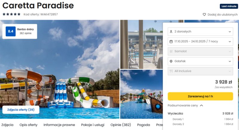Na miejscu czeka nocleg w hotelu Caretta Paradise, położonym w spokojnej okolicy, zaledwie kilka minut spacerem od plaży. Otoczony zielenią, w nowoczesnym stylu, obiekt sprzyja odpoczynkowi, a jego liczne udogodnienia zadowolą zarówno dorosłych, jak i dzieci. Do dyspozycji gości jest m.in. aquapark, tematyczne restauracje oraz programy animacyjne, które skutecznie wypełnią czas najmłodszym członkom rodziny.