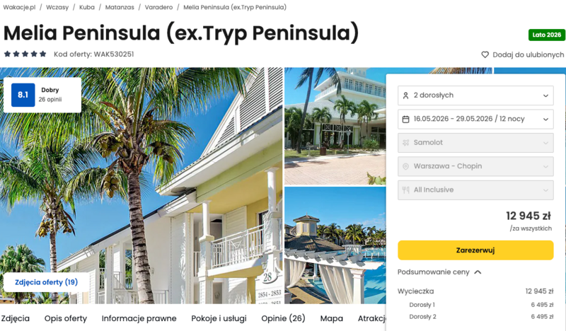 Wczasy na Kubie w wersji lux: 12 dni w 5* Melia Peninsula z all inclusive od 6473 zł