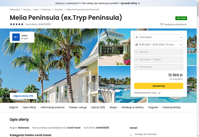 Aktualizacja: Wczasy na Kubie w wersji lux: 12 dni w 5* Melia Peninsula z all inclusive od 6473 zł