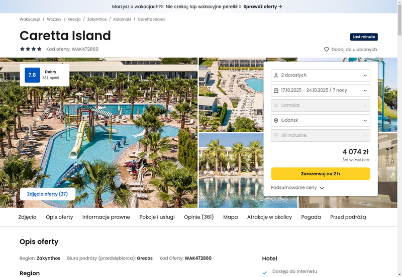 Aktualizacja: Grecja (Zakintos) last minute: Komfortowy 4* Caretta Island z all inclusive od 1901 zł