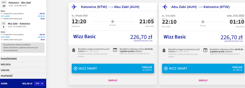 Wyloty z Katowic do Abu Zabi to świetna propozycja dla osób szukających ciekawego kierunku na wypad. Połączenie bezpośrednie to duży plus — bez przesiadek i zbędnego stresu, a do tego sporo zaoszczędzonego czasu.