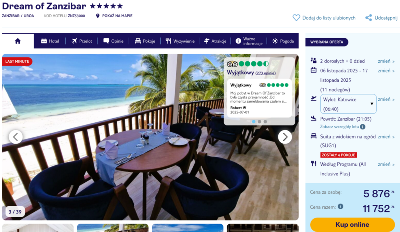Całość sprawia, że wypoczynek w Dream of Zanzibar to nie tylko ucieczka od codzienności, ale też szansa na złapanie oddechu, zanurzenie się w nowym rytmie i napełnienie się pozytywną energią. To pakiet, który łączy komfort, klimat i wyjątkowe wrażenia – warto dać się skusić.