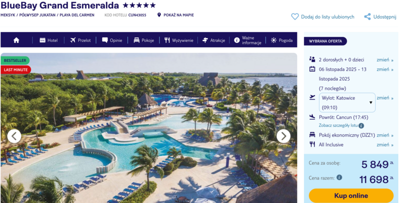 Wylot z Katowic zaplanowano na pierwszą połowę miesiąca, a na miejscu czeka luksusowy wypoczynek w otoczeniu tropikalnej przyrody i klimatu idealnego do odpoczynku. Wczesny listopad to świetny moment na wyprawę, szczególnie jeśli w planach mamy pobyt w hotelu BlueBay Grand Esmeralda, położonym w sercu półwyspu Jukatan.