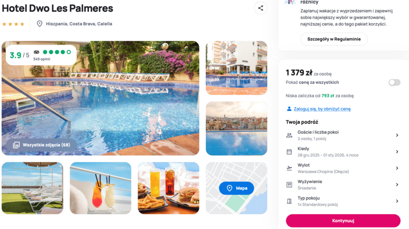 Ta hiszpańska przygoda łączy w sobie wypoczynek nad morzem na Costa Brava z możliwością odkrywania uroków Barcelony. Hotel Dwo Les Palmeres w Calelli cieszy się dobrą opinią wśród gości – chwalą sobie przyjemną atmosferę, wygodne pokoje i lokalizację zaledwie parę kroków od plaży. Na miejscu można też korzystać z basenu i strefy spa, co sprawia, że miejsce świetnie sprawdza się zarówno przy romantycznym wyjeździe, jak i urlopie z rodziną. Sporym plusem są również smaczne posiłki – kuchnia hotelowa zbiera pochwały zarówno od miłośników lokalnych smaków, jak i tych, którzy wolą klasykę.