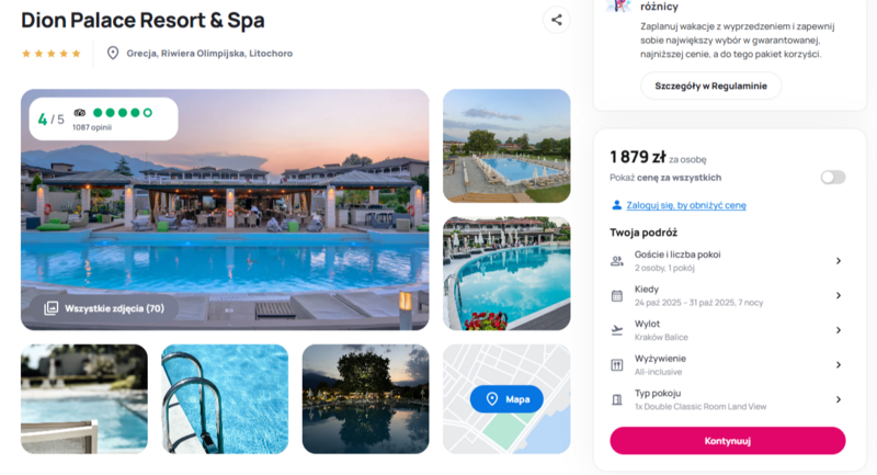Pogoda pod koniec października w Grecji potrafi przyjemnie zaskoczyć – średnia temperatura to około 20 stopni Celsjusza, więc warunki są bardzo sprzyjające, zarówno na plażowanie, jak i na aktywny urlop. Biorąc pod uwagę ofertę all inclusive i standard hotelu, propozycja wyjazdu do Dion Palace Resort & Spa zapowiada się naprawdę dobrze w kontekście ceny.