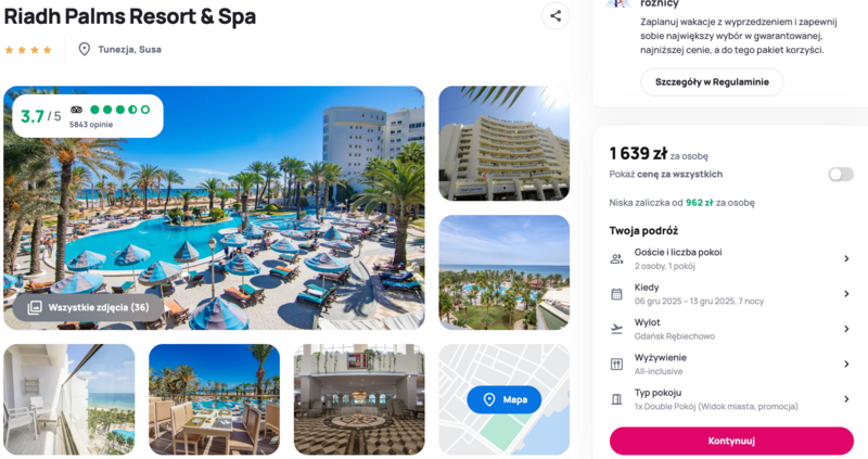 Na miejscu czeka hotel Riadh Palms Resort & Spa, który oferuje wygodną formułę all inclusive. Posiłki i napoje są w cenie, co pozwala cieszyć się pobytem bez myślenia o dodatkowych kosztach. Obiekt leży kilka kroków od plaży, a z balkonów pokojów roztacza się widok na morze lub ogród. Goście często chwalą nie tylko dobrą lokalizację i przytulne wnętrza, ale też serdeczną obsługę i ofertę animacji, które urozmaicają każdy dzień.