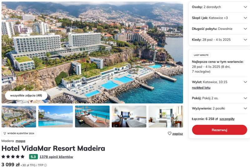 Jednym z najbardziej wyróżniających się hoteli na wyspie jest pięciogwiazdkowy VidaMar Resort Madeira. Elegancki, nowoczesny i idealnie położony — tuż nad oceanem. Widoki robią wrażenie z każdego zakątka obiektu, a bezpośredni dostęp do wody to dodatkowy atut dla tych, którzy chcą po prostu zanurzyć się w relaksie. Goście często chwalą kuchnię, a duży wybór dań — również bezglutenowych — pozwala cieszyć się posiłkami bez ograniczeń.