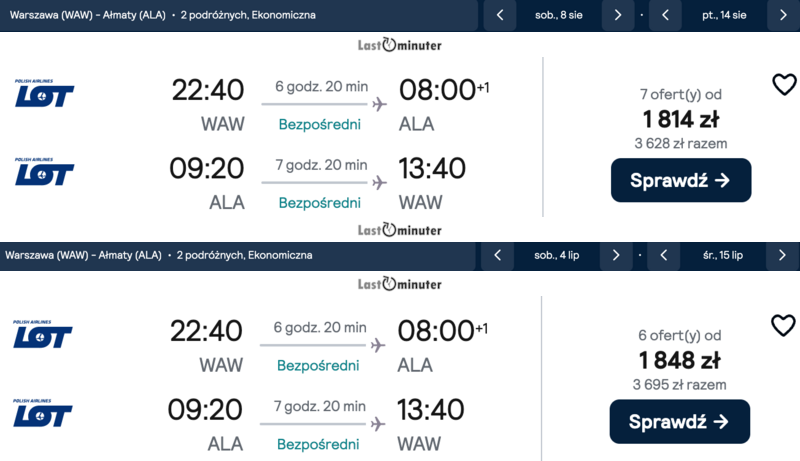 Dzięki wygodnym, bezpośrednim połączeniom i stosunkowo krótkiemu lotowi, podróż do Kazachstanu staje się dostępna nie tylko dla zapalonych podróżników, ale też dla tych, którzy chcą po prostu spróbować czegoś nowego. Ałmaty to dobry wybór zarówno na krótki urlop, weekendowy wypad, jak i dłuższą podróż – szczególnie jeśli szukasz kierunku spoza oczywistych szlaków turystycznych.Dostępnych jest dużo terminów od końca czerwca do sierpnia przyszłego roku. Zakwaterowania szukaj tutaj (KLIK).