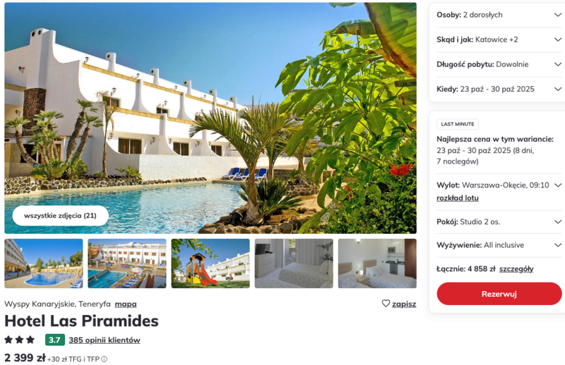 Proponowana oferta obejmuje zakwaterowanie w trzygwiazdkowym hotelu Las Piramides, zlokalizowanym w samym sercu Playa de las Americas – tuż obok plaży i w sąsiedztwie licznych restauracji, sklepów oraz klubów. Na miejscu do dyspozycji są cztery baseny i restauracja, a opcja all inclusive to wygodne rozwiązanie, dzięki któremu można bez stresu cieszyć się lokalnymi smakami przez cały dzień. Goście chwalą hotel za czystość i uprzejmą obsługę, choć niektórzy zwracają uwagę na pewną powtarzalność w serwowanych posiłkach.