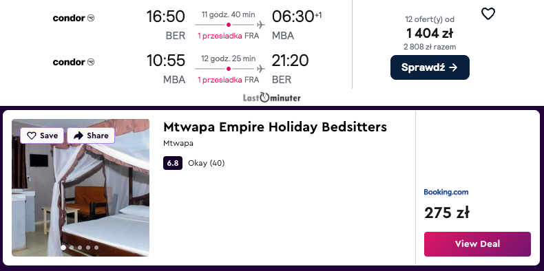 Na miejscu możesz liczyć na idealną pogodę – słońce, ciepło i około 30 stopni Celsjusza. Mombasa w tym czasie sprzyja zarówno leniwemu odpoczynkowi na plaży, jak i aktywnemu zwiedzaniu okolicy.Biorąc pod uwagę standardowe ceny, ta propozycja wypada naprawdę korzystnie. Choć podróż obejmuje przesiadkę, całość jest zaplanowana w sposób, który zapewnia stosunkowo wygodne dotarcie do celu.